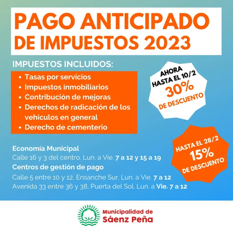 Sáenz Peña: extienden el descuento de hasta el 30% en el pago anticipado de impuestos 2023