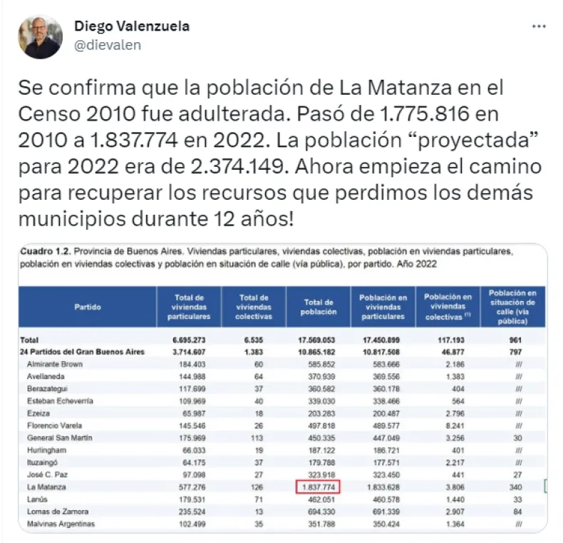 "Se confirma que la población de La Matanza en el Censo 2010 fue adulterada. Pasó de 1.775.816 en 2010 a 1.837.774 en 2022. La población "proyectada" para 2022 era de 2.374.149. ¡Ahora empieza el camino para recuperar los recursos que perdimos los demás municipios durante 12 años!", expresó el intendente de Tres de Febrero, Diego Valenzuela.