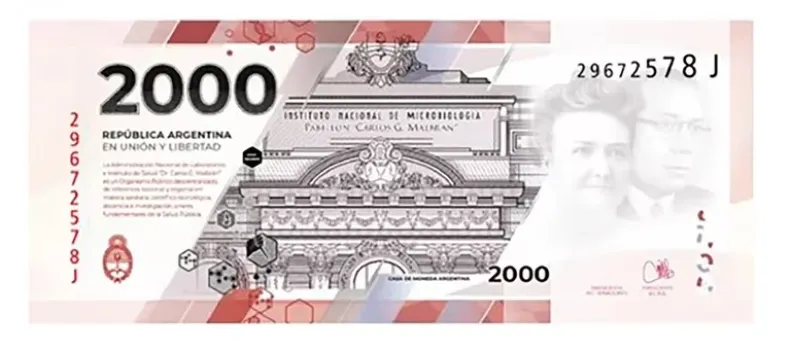 El Banco Central comunicó hoy la emisión del nuevo billete de $ 2000, en el que aparecen dos doctores reconocidos y el Instituto Malbrán.