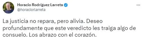 El jefe de Gobierno porteño, Horacio Rodríguez Larreta, aseguró que la "justicia no repara, pero alivia" y agregó desde su cuenta de Twitter: Deseo profundamente que este veredicto les traiga algo de consuelo. Los abrazo con el corazón".