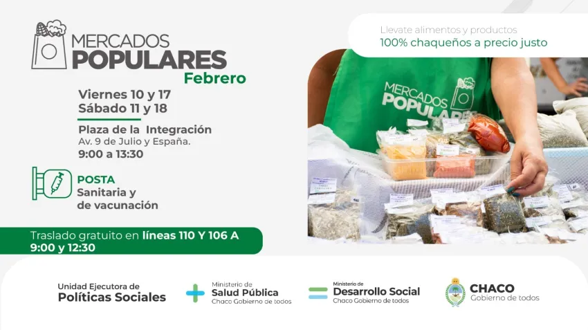 Los viernes 10 y 17 y los sábados 11 y 18 de febrero, desde las 9 hasta las 13:30 en la plaza de la Integración de Resistencia, ubicada en la avenida 9 de Julio y España, se realizarán otra jornada de Mercados Populares.