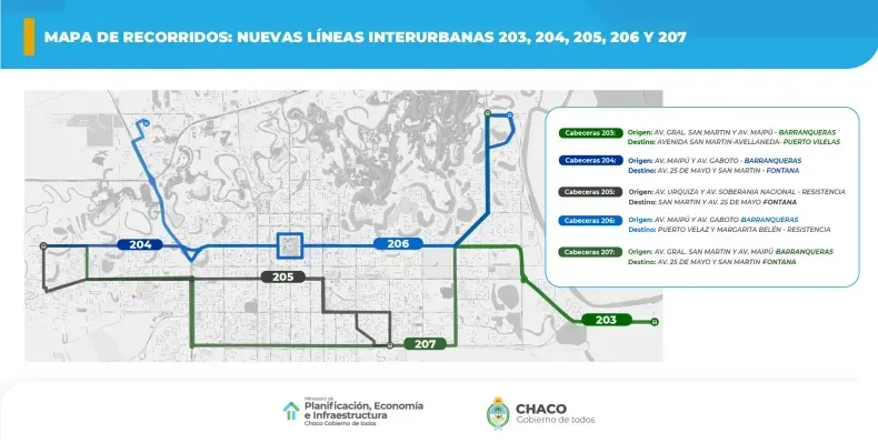 Mientras que la línea 206, que conectará Barranqueras con la zona Norte de Resistencia, iniciará su trayecto en las calles Puerto Velaz y Margarita Belén, pasando por las avenidas 9 de Julio y 25 de Mayo en el centro de Resistencia.