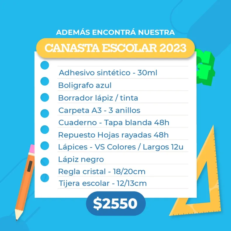 La canasta escolar 2023 consta de un total de 10 artículos de primera necesidad, por un valor de $2550 y que incluye; un adhesivo sintético (30 ml), bolígrafo azul, borrador de lápiz y tinta, carpeta A3-3 anillos, un cuaderno tapa blanda de 48 hojas, un repuesto de 48 hojas rayadas, 12 lápices de colores (largos), lápiz negro, regla de cristal (18-20 cm) y una tijera escolar (12-13 cm).