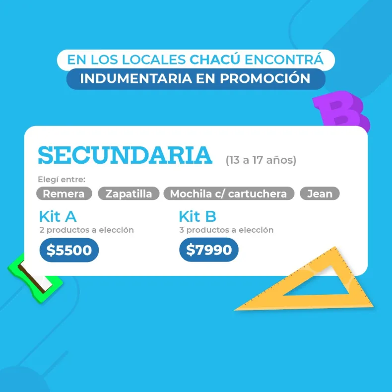 Por último, la opción para secundaria (para jóvenes de 13 a 17 años), contarán con dos kits: Kit A (dos productos a elección) por $5500 y el Kit B (3 productos a elección) a $7990. Los productos a elección son: remera, zapatilla, mochila con cartuchera y jean.
