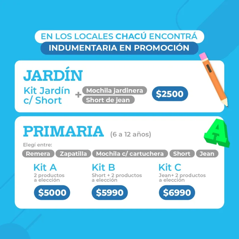 Entre las promociones, se encuentra el Kit Jardín con short, más una mochila jardinera más un short de jean a $2500. Para primaria, para niñas y niños de 6 a 12 años), se podrá podrán elegir entre tres tipos de kits: Kit A (2 productos a elección) a $5000; Kit B (short más 2 productos a elección) a $5990 y el Kit C (jean más dos productos a elección) $6990. Los productos a elección son: remeras, zapatillas, mochila con cartuchera, short y jean.