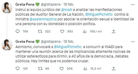 A través de un mensaje de Twitter, Pena informó que convocará a Pichetto a una reunión para conversar "acerca de las implicancias altamente nocivas de utilizar estereotipos para dirimir, a 40 años de la democracia, debates públicos". "Hay limites que no podemos cruzar", enfatizó la sucesora de Victoria Donda.
