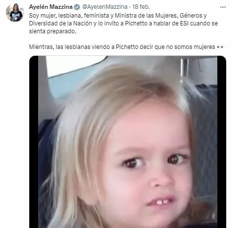 "Soy mujer, lesbiana, feminista y Ministra de las Mujeres, Géneros y Diversidad de la Nación y lo invito a Pichetto a hablar de ESI cuando se sienta preparado. Mientras, las lesbianas viendo a Pichetto decir que no somos mujeres", publicó la referente puntana junto al popular meme de la niña sentada en un auto, que mira con desaprobación.