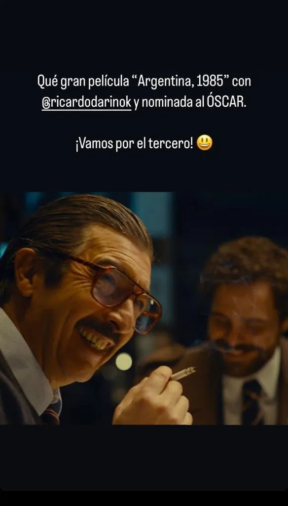 Aprovechando el tiempo libre, Messi subió una publicación a sus redes sociales tras ver la película "Argentina, 1985", que es una de las candidatas en los próximos premios Oscar como mejor película internacional. "Qué gran película Argentina, 1985 con Ricardo Darín y nominada al Oscar", escribió y acompañó la historia en su cuenta de Instagram con la imagen de una escena del film en la que está el experimentado actor y Peter Lanzani, riéndose.