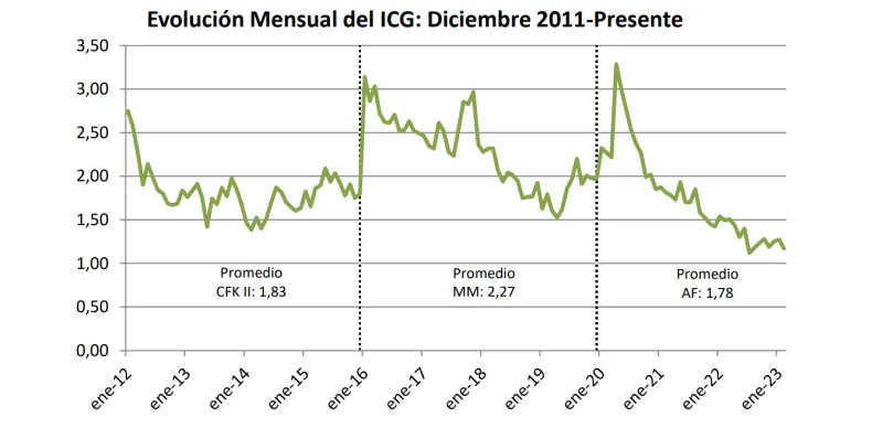 El índice se presenta en una escala que varía entre 0 y 5, siendo 1,12 puntos el nivel más bajo alcanzado hasta ahora durante la presidencia de Alberto Fernández y uno de los peores desde la creación del ICG en 2001.
