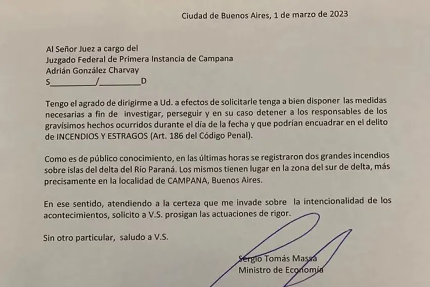 En la carta dirigida al Juez Federal de Primera Instancia de Campana, Adrián González Charvay, el ministro de Economía, pidió "investigar, perseguir y en su caso detener a los responsables de los gravísimos hechos ocurridos durante el día de la fecha (1 de marzo de 2023) y que podrían encuadrar en el delito de incendios y estragos (Art. 186 del Código Penal)".