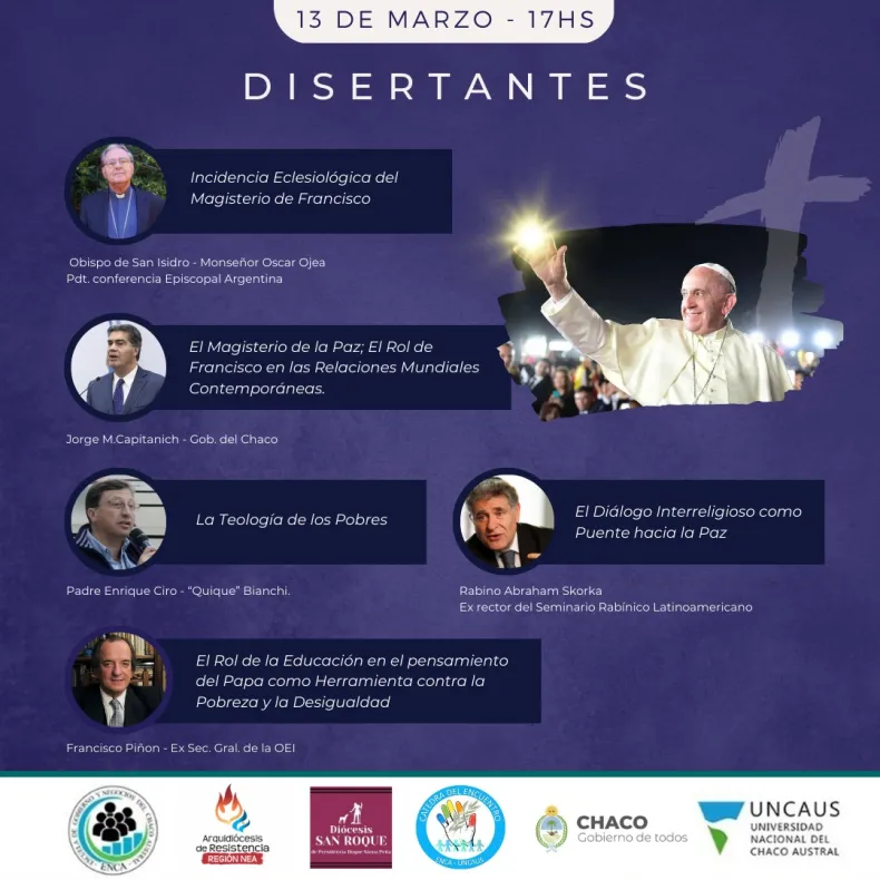 En este encuentro participará el obispo de San Isidro, monseñor Oscar Ojea, con el tema "incidencia eclesiológica del magisterio Francisco"; el gobernador de la provincia de Chaco, Jorge Capitanich, con "el magisterio de la paz; el rol de Francisco en las relaciones mundiales contemporáneas"; el ex secretario de general de la OEI, Francisco Piñon, con "el rol de la educación en el pensamiento del papa, como herramienta contra la pobreza y la desigualdad"; el padre Enrique Ciro "Quique" Bianchi con "la teoría de los pobres"; y el rabino Abraham Skorka, ex rector del Seminario Rabínico Latinoamericano con "el diálogo interreligioso como puente hacia la paz".