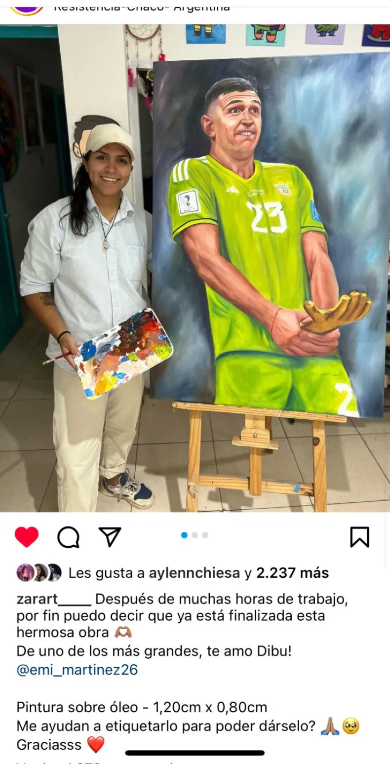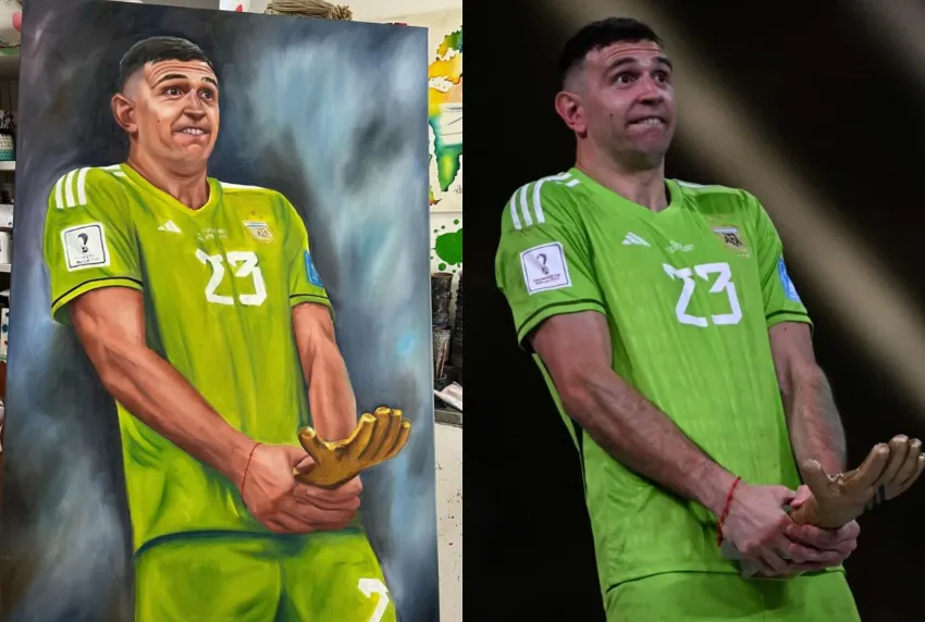 Una joven chaqueña de 20 años llamada Victoria Zaragoza es pintora y ahora realizó una gran obra de arte, hizo un retrato de la icónica foto del Dibu Martínez cuando ganó el premio a mejor arquero en el Mundial de Qatar 2022.