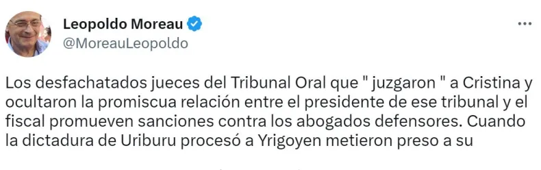 "Los desfachatados jueces del Tribunal Oral que ‘juzgaron’ a Cristina y ocultaron la promiscua relación entre el presidente de ese tribunal y el fiscal, promueven sanciones contra los abogados defensores", indicó el legislador oficialista en su cuenta de Twitter, sobre los jueces del Tribunal Oral Federal 2 que condenaron a la vicepresidente a seis años de prisión e inhabilitación perpetua para ejercer cargos públicos.