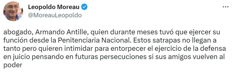 Y realizó una polémica comparación: "Cuando la dictadura de Uriburu procesó a Yrigoyen, metieron preso a su abogado, Armando Antille, quien durante meses tuvo que ejercer su función desde la Penitenciaria Nacional. Estos sátrapas no llegan a tanto, pero quieren intimidar para entorpecer el ejercicio de la defensa en juicio pensando en futuras persecuciones si sus amigos vuelven al poder", concluyó el diputado nacional.