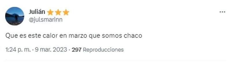 "Que es este calor en marzo que somos chaco", "La gente que vive en Chaco, por ejemplo, sufre siempre este calor?" o "Nos estamos cagando de calor en el colegio xq nos apagaron el aire y la respuesta de la profesora fue, bueno chicos en el chaco viven así todos los días ESTOY TENTADA", son algunos de los tweets que dejaron con tono de broma y a fin de expresar su malestar por el intenso calor que se vive.