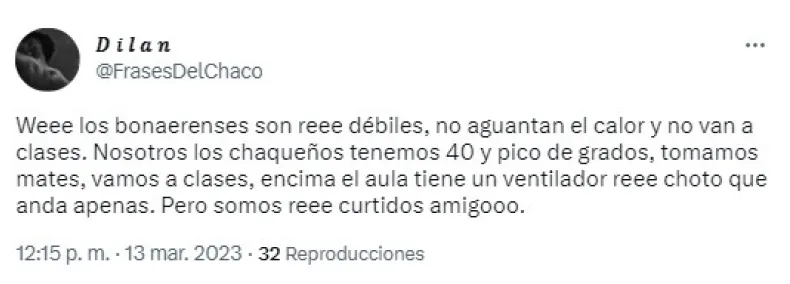 "Weee los bonaerenses son reee débiles, no aguantan el calor y no van a clases. Nosotros los chaqueños tenemos 40 y pico de grados, tomamos mates, vamos a clases, encima el aula tiene un ventilador reee choto que anda apenas. Pero somos reee curtidos amigooo", escribió uno de los usuarios.