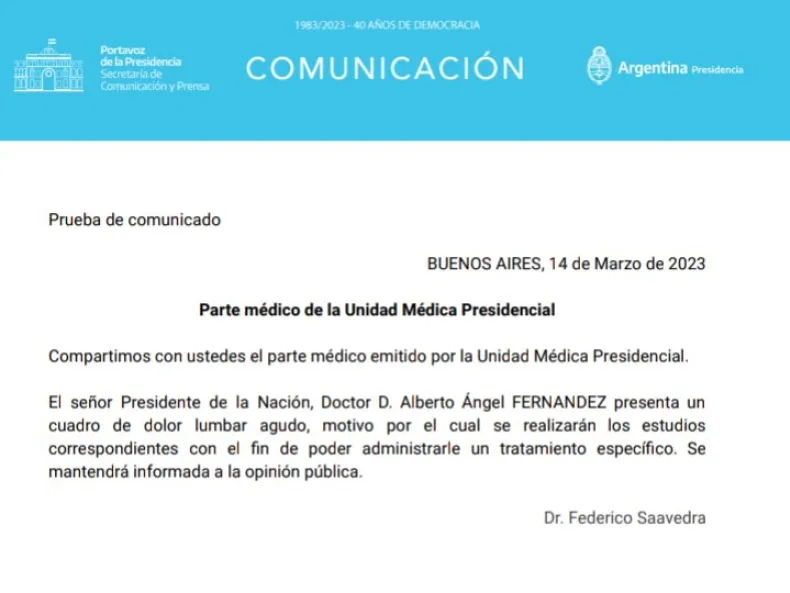"El señor Presidente de la Nación, Doctor D. Alberto Ángel Fernández, presenta un cuadro de dolor lumbar agudo, motivo por el cual se realizarán estudios correspondientes con el fin de poder administrarle un tratamiento específico", explica el comunicado oficial publicado por la Portavoz de la Presidencia.