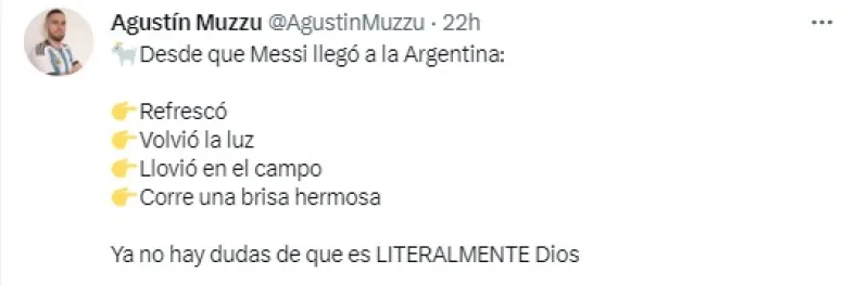 En su cuenta de Twitter, Agustín Mazzu escribió: "Desde que llegó Messi a la Argentina, refrescó, volvió la luz, llovió en el campo y corre una brisa hermosa".