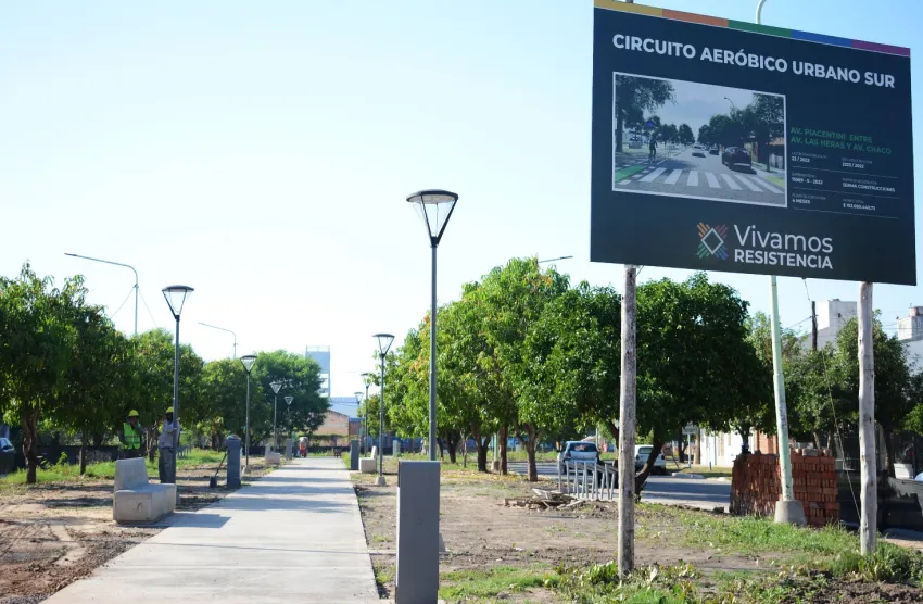 Con el 90 por ciento de ejecución, para fines del mes de abril se prevé la finalización de las dos obras que componen el Circuito Aeróbico Sur de Resistencia que realiza el Municipio en las avenidas Las Heras y López Piacentini. Las mismas forman parte del Plan Director de Espacios Públicos y contemplan la construcción de parterres, iluminación, parquizado, equipamiento para la realización de actividades físicas y la incorporación de circuitos exclusivos para bicicletas.