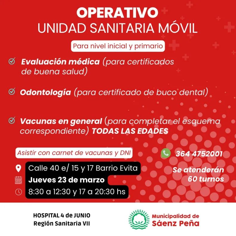 La Unidad Sanitaria Móvil del municipio continúa recorriendo los barrios de la ciudad, el día jueves 23 de marzo se realizará un nuevo operativo en la calle 40 entre 15 y 17 del barrio Evita.