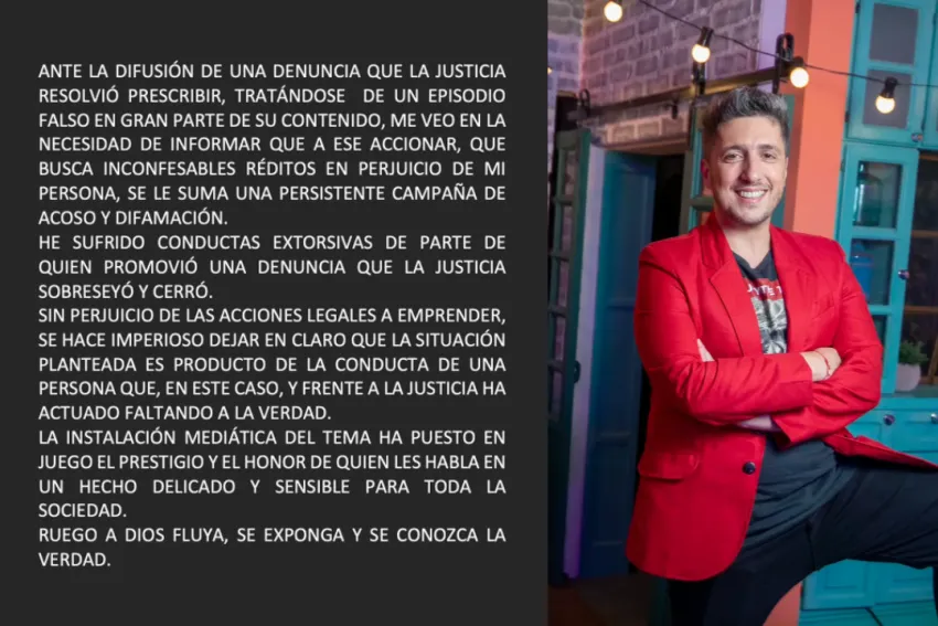 "He sufrido conductas extorsivas de parte de quien promovió una denuncia que la justicia sobreseyó y cerró. Sin perjuicio de las acciones legales a emprender, se hace imperioso dejar en claro que la situación planteada es producto de la conducta de una persona que, en este caso, y frente a la justicia ha actuado faltando a la verdad. La instalación mediática del tema ha puesto en juego el prestigio y el honor de quien les habla en un hecho delicado y sensible para toda la sociedad. Ruego a dios fluya, se exponga y se conozca la verdad", concluyó el artista que difundió el escrito durante la tarde de este jueves en todas sus redes sociales.