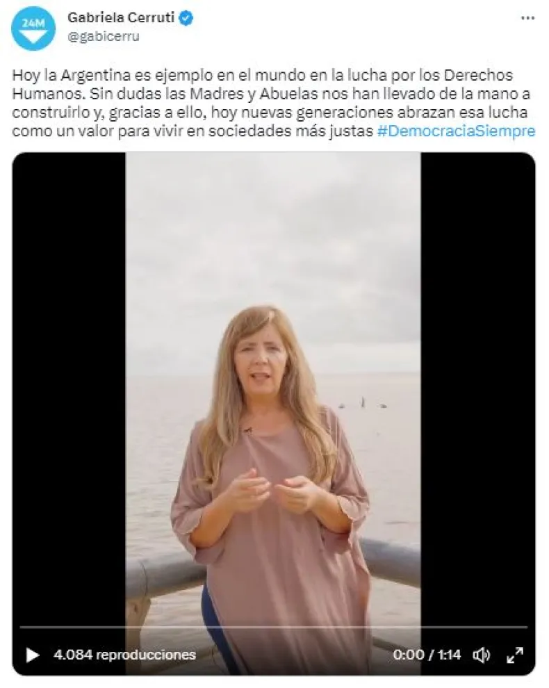 En un video filmado en el Parque de la Memoria, en la costanera del Río de la Plata, la portavoz presidencial expresó: "Hoy la Argentina es ejemplo en el mundo en la lucha por los Derechos Humanos. Sin dudas las Madres y Abuelas nos han llevado de la mano a construirlo y, gracias a ello, hoy nuevas generaciones abrazan esa lucha como un valor para vivir en sociedades más justa".