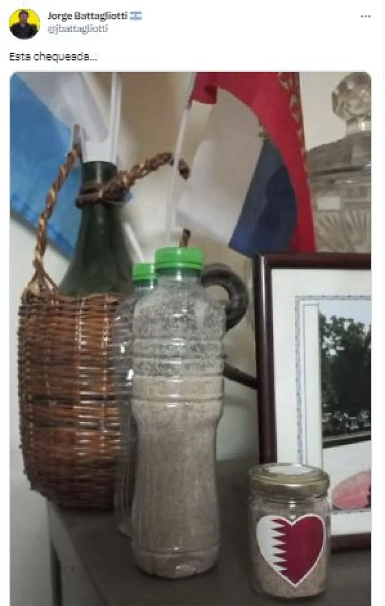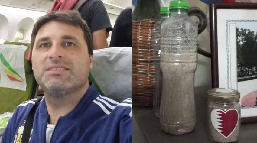 Jorge Batagliotti es periodista deportivo de la ciudad de Santa Fe y durante su estadía en Qatar por el mundial recolectó arena de las playas de Qatar y la trajo al país.