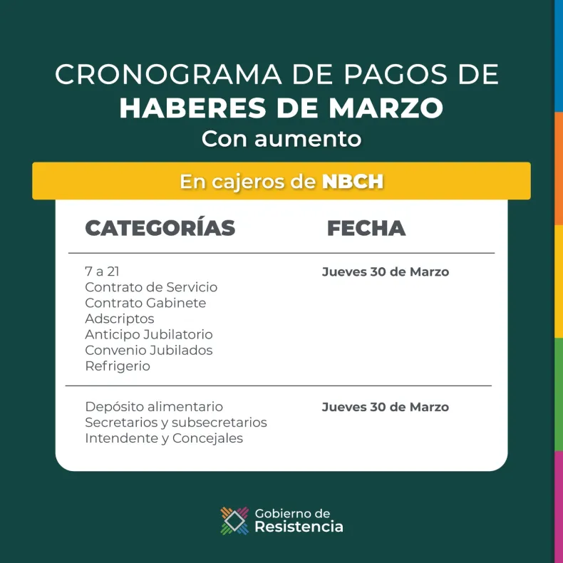 Pasado el mediodía, se depositará el sueldo en los cajeros electrónicos del Nuevo Banco del Chaco, correspondiente a las categorías 7 a 21, contratados de servicios, depósitos judiciales, anticipos jubilatorios, convenio con jubilados. También cobrarán contratados de gabinete, secretarios y subsecretarios, concejales e intendente.