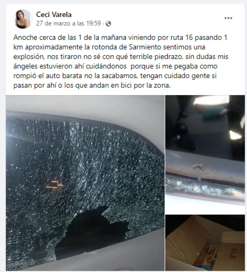 El hecho tuvo lugar en la ruta 16 en el kilómetro 1. En ese momento, el auto recibió un "piedrazo". "Sin dudas mis ángeles estuvieron ahí cuidándonos" manifestó la damnificada.