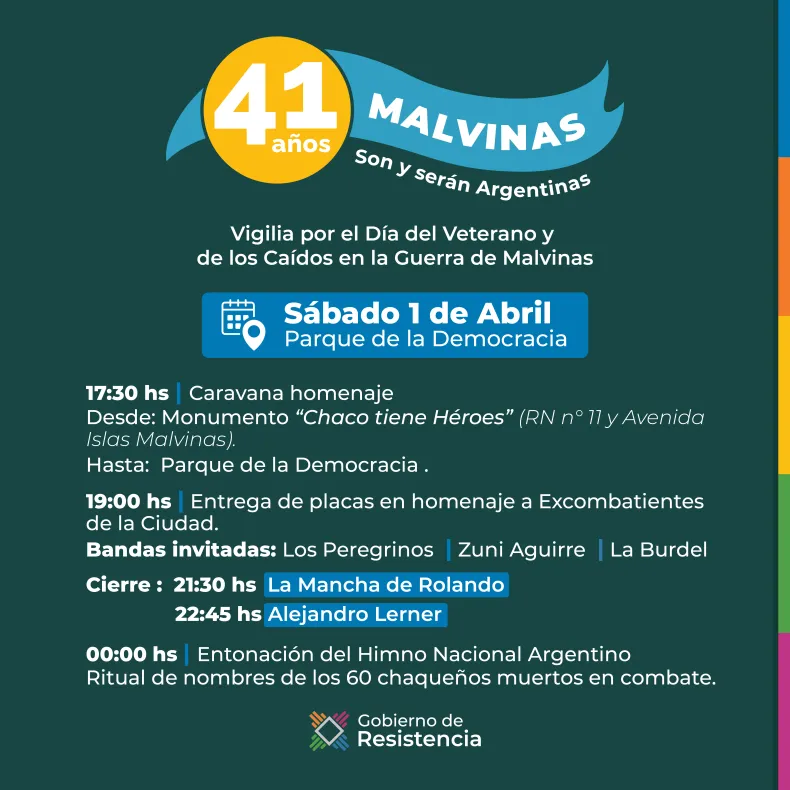 Las actividades del sábado comenzarán desde las 17:30 horas con una caravana homenaje desde el nuevo monumento "Chaco tiene héroes", ubicado en ruta nacional 11 y avenida Malvinas Argentinas, hasta el Parque de la Democracia. Además, se realizará una entrega de placas en homenaje a excombatientes de la ciudad y actuarán diversas bandas invitadas como Los Peregrinos, Zuni Aguirre y La Burdel. La jornada culminará con las actuaciones de La Mancha de Rolando y Alejandro Lerner.
