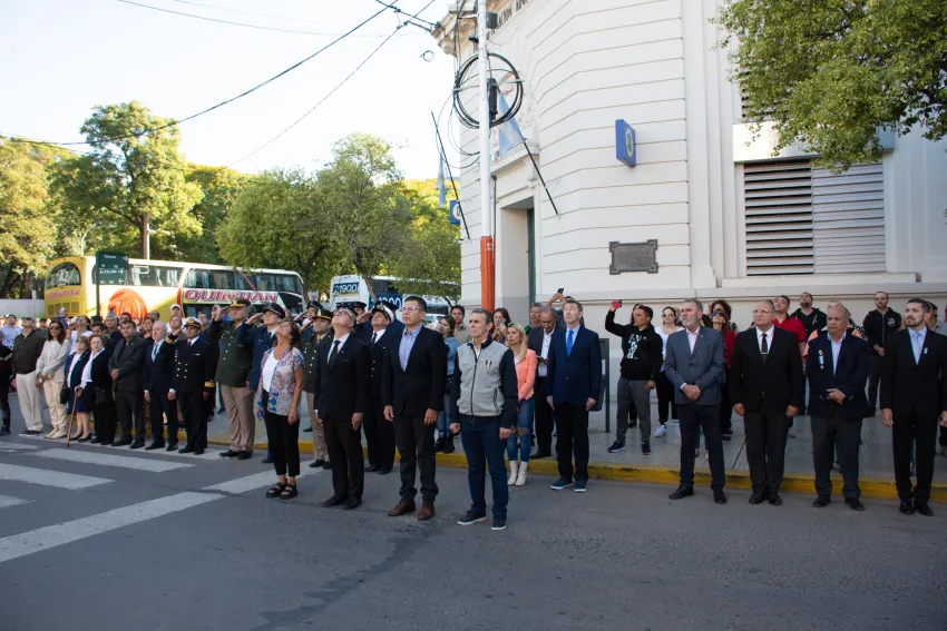 La ceremonia oficial se inició con el izamiento de la Bandera Nacional en el Mástil Mayor de la ciudad, a cargo del secretario de Planificación Infraestructura y Ambiente, Guillermo Monzón, junto a la presidenta del Superior Tribunal de Justicia, Isabel Iride de Grillo.