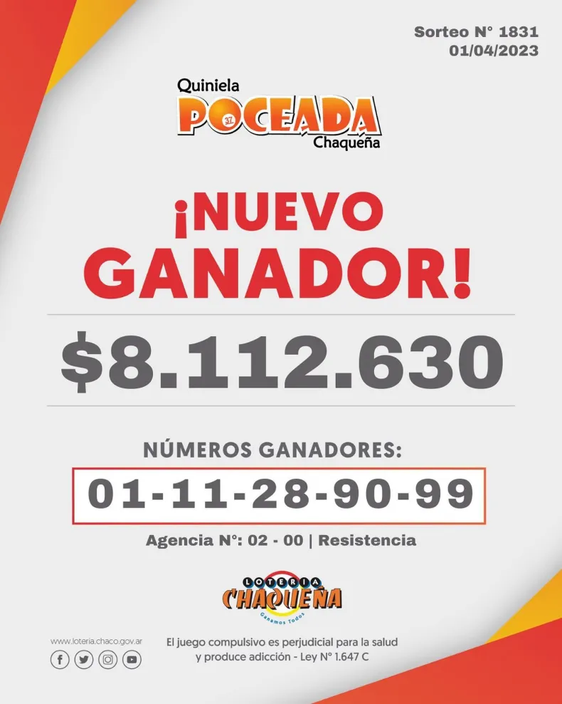 Este sábado a última hora se llevó a cabo el sorteo de la Quiniela Poceada Chaqueña y una persona oriunda de la capital chaqueña se convirtió en el nuevo ganador de un pozo superior a 8 millones de pesos.