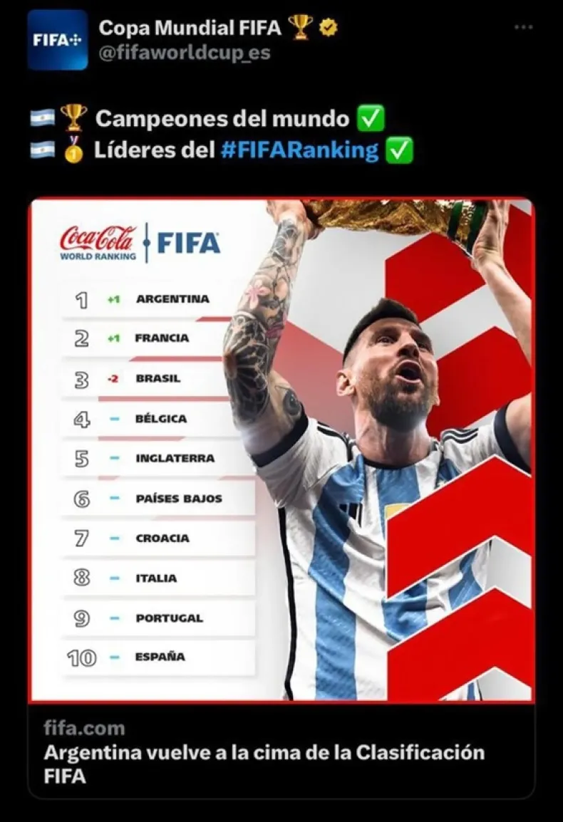 Este ascenso de Argentina se debe al título mundial logrado en Qatar 2022 y a los amistosos ganados en nuestro país ante Panamá (2-0) y Curazao (7-0), sumado a la derrota de Brasil en un amistoso ante Marruecos.