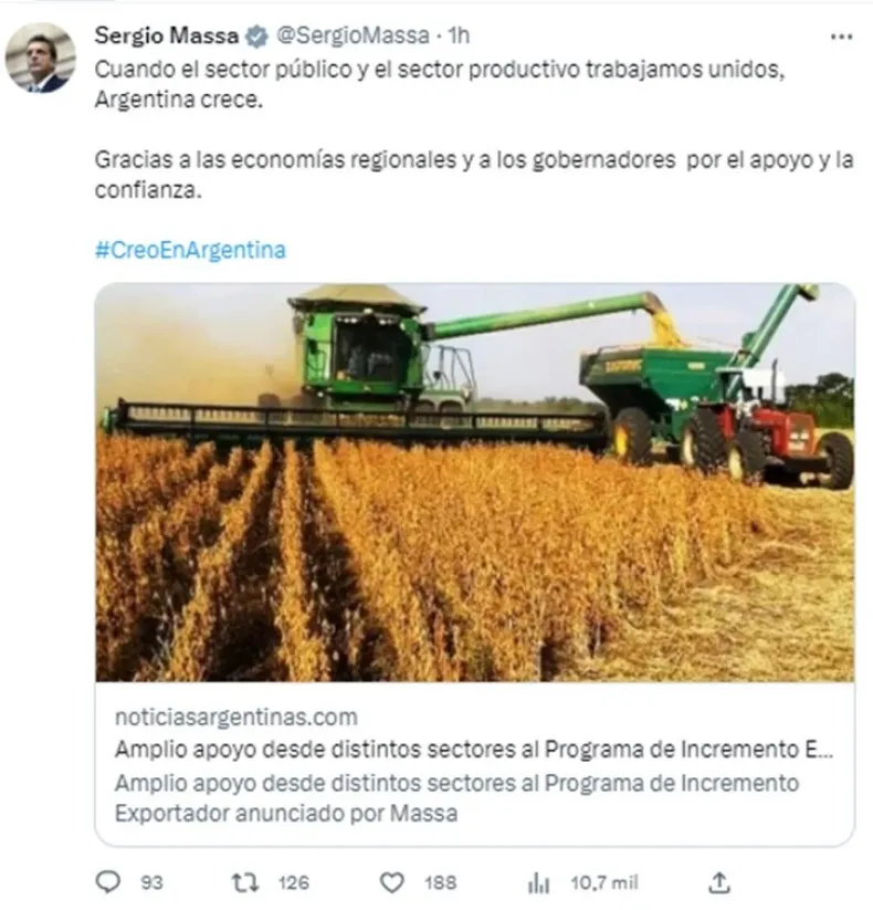 Con un mensaje mediante la red social Twitter, el ministro de Economía aseguró que "cuando el sector público y el productivo trabajan unidos, Argentina crece". Por ello, agradeció el reconocimiento ante el programa.