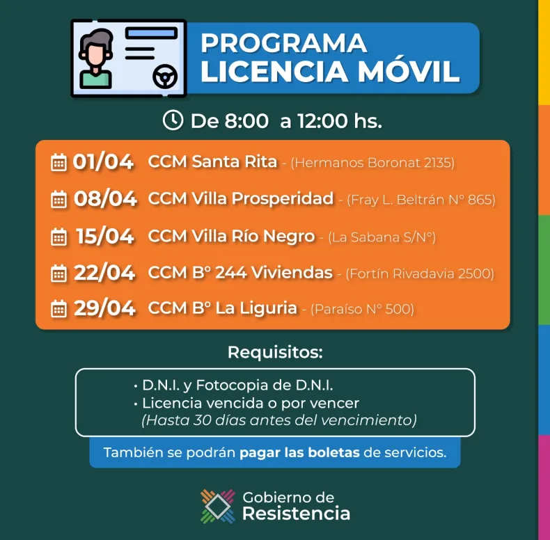 "Licencia móvil" y "Mi Primera Licencia" llegarán este sábado 8 de abril al Centro Comunitario Municipal (CCM) Villa Prosperidad, donde de 8 a 12 ofrecerán el servicio de renovación de carnets de conducir, sumando una jornada ideal para aquellas personas que durante la semana no pueden gestionar ese trámite por razones laborales.
