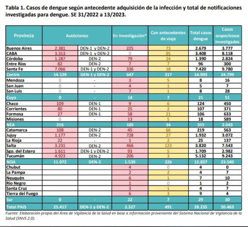 A nivel nacional, según el Boletín Epidemiológico difundido que publica la cartera sanitaria semanalmente, hasta la semana epidemiológica 13 de 2023 (es decir hasta el 01/04) se notificaron en el país 28.235 casos de dengue, de los cuales 25.419 adquirieron la infección en la Argentina.