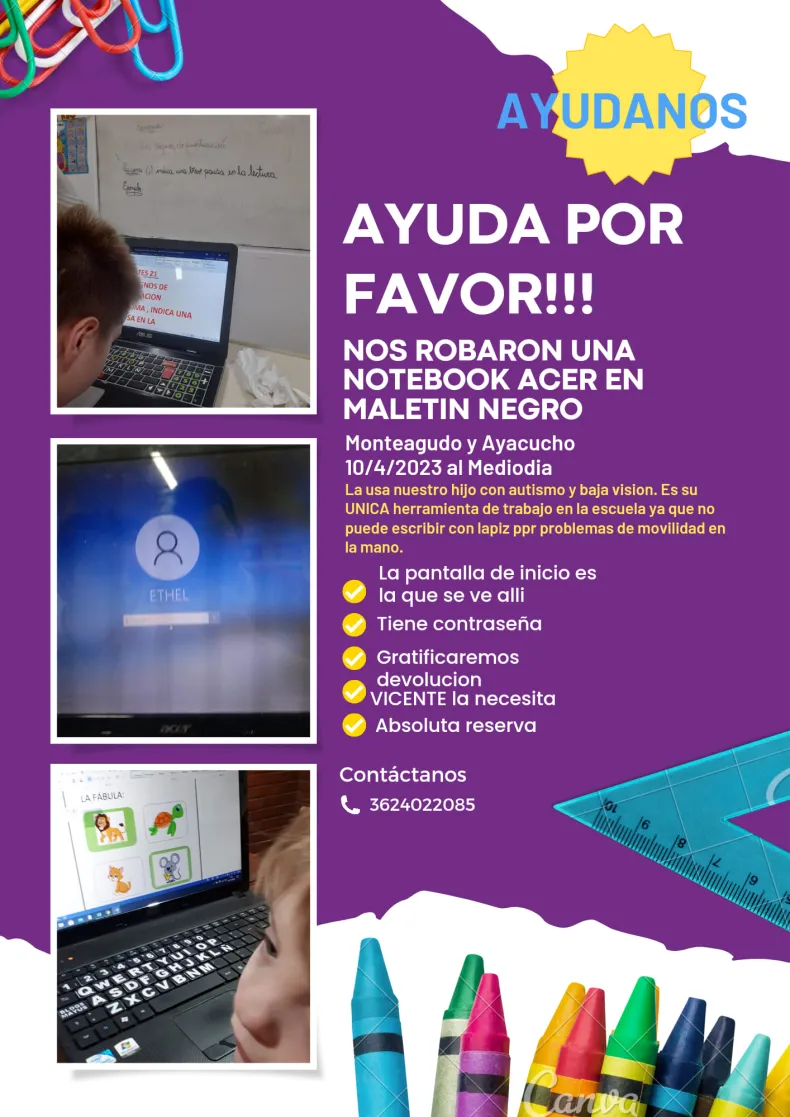 Se trataba de una notebook Acer, adaptada para el uso de Vicente, ya que el niño no puede escribir por problemas de movilidad en sus manos. Con desesperación, la mamá de Vicente, Ángeles Díaz Marvanek, difundió en redes sociales el robo de la computadora y pidió ayuda para recuperada.