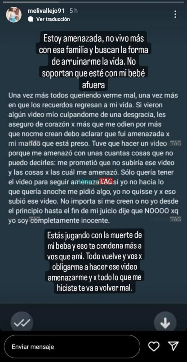 "Estoy amenazada, no vivo más con esa familia y buscan la forma de arruinarme la vida. No soportan que esté con mi bebé afuera", dijo Vallejos en su posteo.