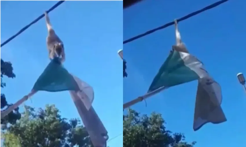 De la inseguridad nadie se salva: un mono colgado desde cable de luz intentó robar una bandera
