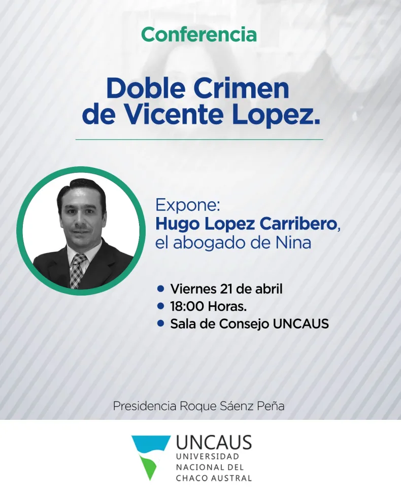 Este viernes, la Universidad Nacional del Chaco Austral realizará una conferencia con el abogado Hugo López Carribero, quien defendió a María Ninfa Aquino"Nina" en el Caso de Doble Crimen de Vicente López, municipio de la Provincia de Buenos Aires. La entrada es libre y gratuita en la Sala de Consejo de la UNCAus.