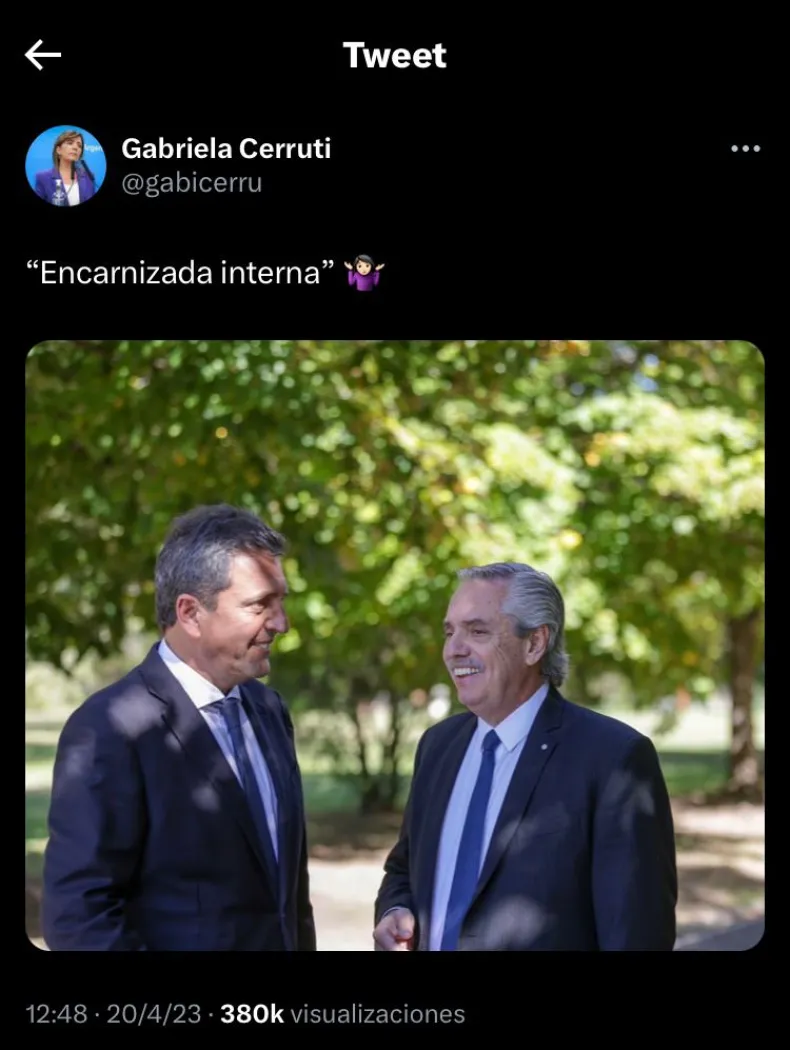 Además, hace unos días se rumorean cambios respecto a la interna del Palacio de Hacienda. Ante esto, Gabriel Cerutti, la vocera presidencial, publicó un mensaje en la red social Twitter haciendo alusión a estos rumores.