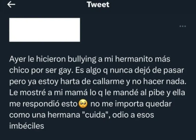 En el tweet en donde muestra el mensaje enviado, la hermana del chico escribe: "Ya estoy harta de callarme y no hacer nada. Le mostré a mi mamá lo que le mandé al pibe y ella me respondió esto. No me importa quedar como una hermana ‘cuida’, odio a esos imbéciles", dijo en referencia a las personas que cometen bullying.