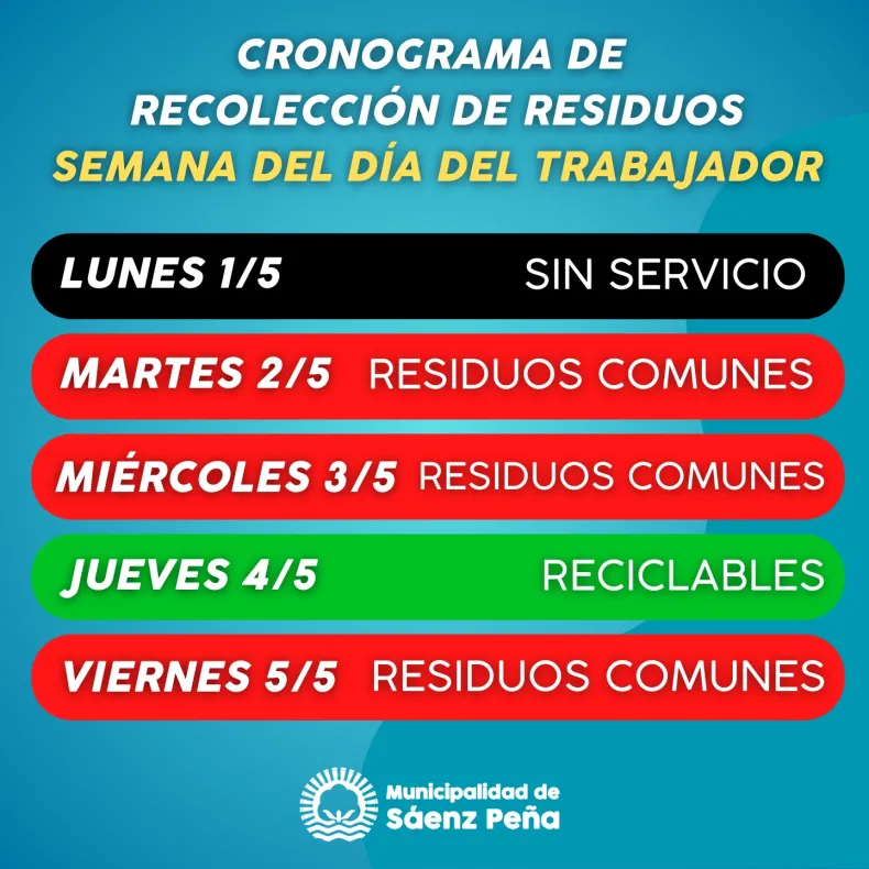 Desde la Secretaría de Servicios Públicos del municipio se informa que la semana del 1 al 5 de mayo habrá modificaciones en el cronograma de recolección de residuos atento al feriado por el Día del Trabajador.