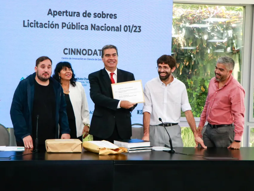 El gobernador Jorge Capitanich participó esta mañana de la apertura de sobres de licitación para la construcción del primer Centro de Innovación en Ciencia de Datos (CINNODAT). "Es un hecho histórico, este nuevo servicio, junto al Centro de Nanotecnología, integrará un ecosistema científico-tecnológico y de innovación productiva para el Chaco y el Norte Grande", destacó el mandatario tras el acto, en el que se presentaron tres ofertas.