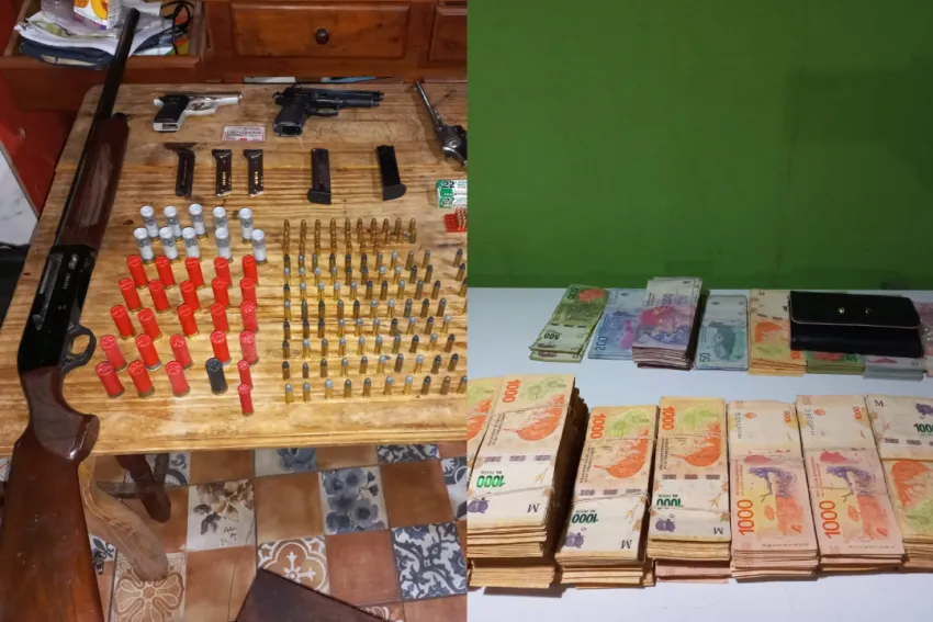 La primera finca allanada se encuentra en el barrio Sarmiento, donde detuvieron a un hombre de 36 años. En su casa, incautaron 2.600.000 de pesos, además de un revolver calibre 38, una escopeta, dos pistolas y diferentes cartuchos y municiones para las armas.
