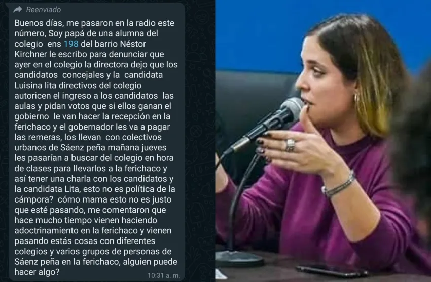 "La directora dejó que los candidatos a concejales y la candidata Luisina Lita ingresen a las aulas y pidan votos y que, si ellos ganan, el gobierno les iba a hacer la recepción en Ferichaco y el gobernador les va a pagar las remeras, los llevan con colectivos urbanos de Sáenz peña mañana jueves a la tarde les pasarían a buscar del colegio en hora de clases para llevarlos a la ferichaco y así tener una charla con los candidatos y la candidata Lita..." señala el mensaje.