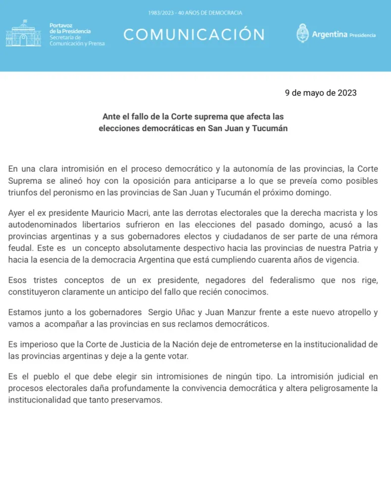 Finalmente, para culminar con sus palabras ratifico que lo que sucedió es una "clara intromisión en el proceso democrático y la autonomía con las provincias". Y, haciendo referencia a la oposición sostuvo que "la Corte Suprema se alineó con la oposición para anticiparse a lo que se preveía como posibles triunfos del peronismo en las provincias de San Juan y Tucumán".