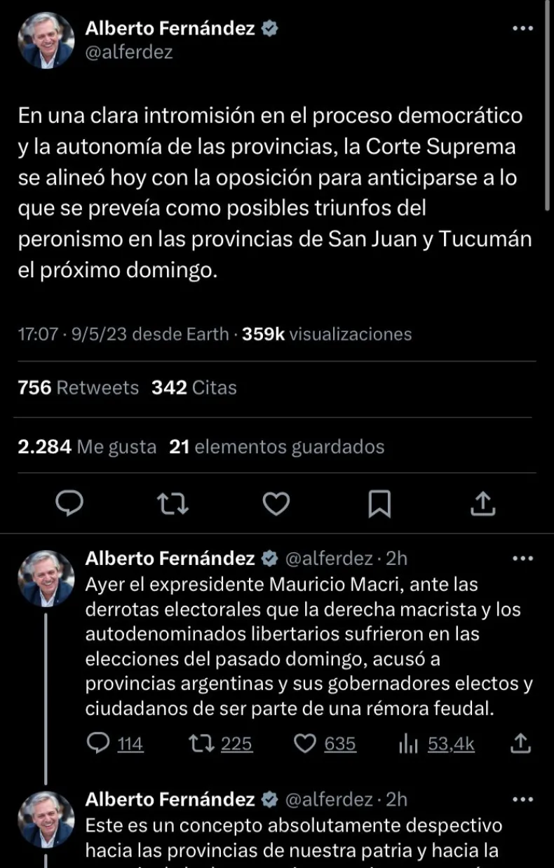 Tras la decisión que tomó la Corte Suprema de Justicia sobre la suspensión de las elecciones de este domingo en las provincias de Tucumán y Salta, mediante una serie de mensajes en su twitter personal, Alberto Fernández opinó al respecto.