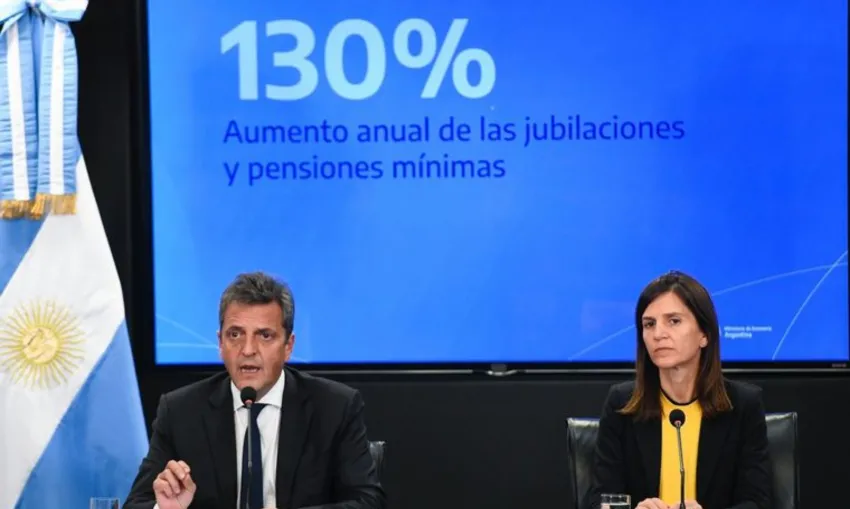 La directora ejecutiva de la ANSES, Fernanda Raverta y el ministro de Economía, Sergio Massa, anunciaron hoy el aumento del 20,92 % que corresponde a la Ley de Movilidad. También mencionaron a un refuerzo que se dará respecto a las jubilaciones y pensiones mínimas de $ 15.000 en junio, $ 17.000 en julio y $ 20.000 en agosto.