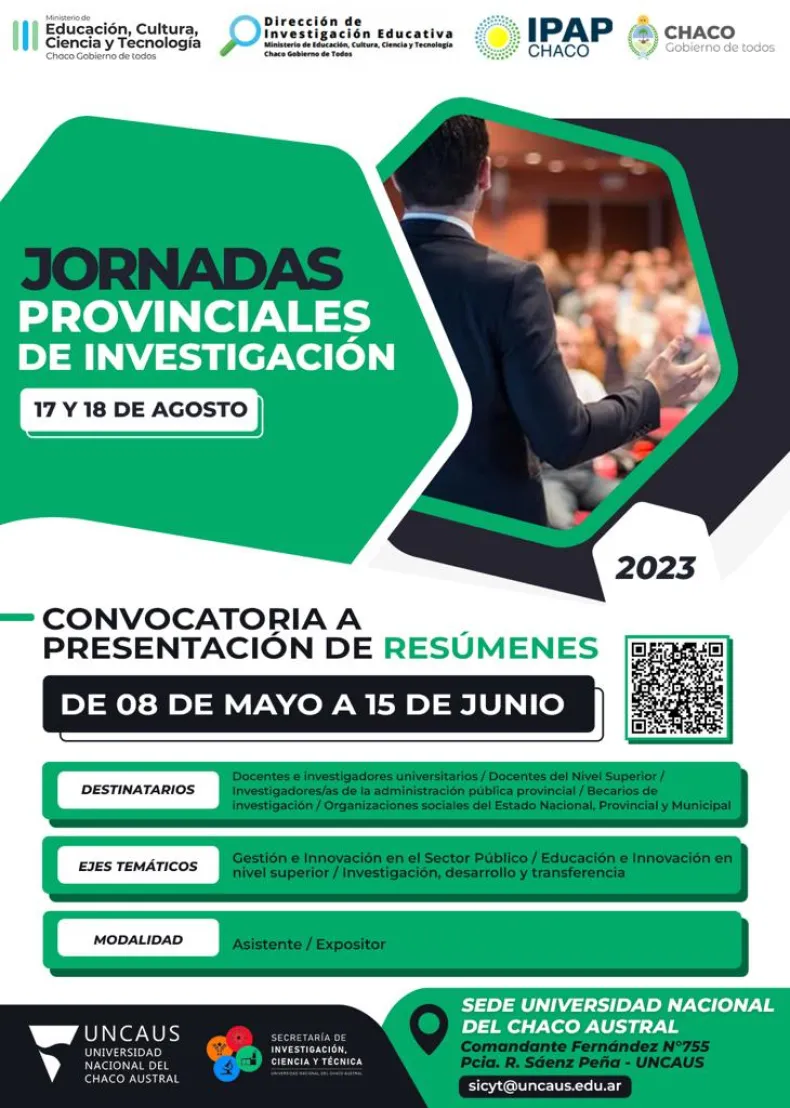 La Universidad Nacional del Chaco Austral (UNCAUS), a través de la Secretaría de Investigación, Ciencia y Técnica, invita a participar de estas Jornadas que son organizadas junto con el Ministerio de Educación, Cultura, Ciencia y Tecnología de la provincia de Chaco y el Instituto Provincial de Administración Pública. Las mismas se realizarán en los días 17 y 18 de agosto en la UNCAUS, situada en la ciudad de Presidencia Roque Sáenz Peña.